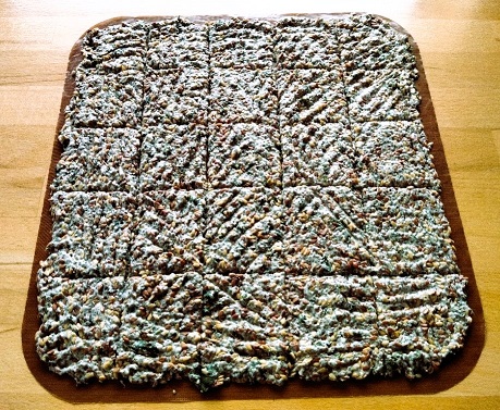 Hmotu ("těsto") klademe na sušící fólie a vidličkou rozprostřeme do stejnoměrné vrstvy. Nožem naznačíme čtverce a takto připravené fólie položíme na kovovou mřížku, vložíme do sušičky a sušíme na cca 45st.C. Má sušička nezahřeje chlebíky na 42st.C, proto zpočátku suším na 50st. a kontroluji teplotu laserovým teploměrem. Poté teplotu sušení snižuji.